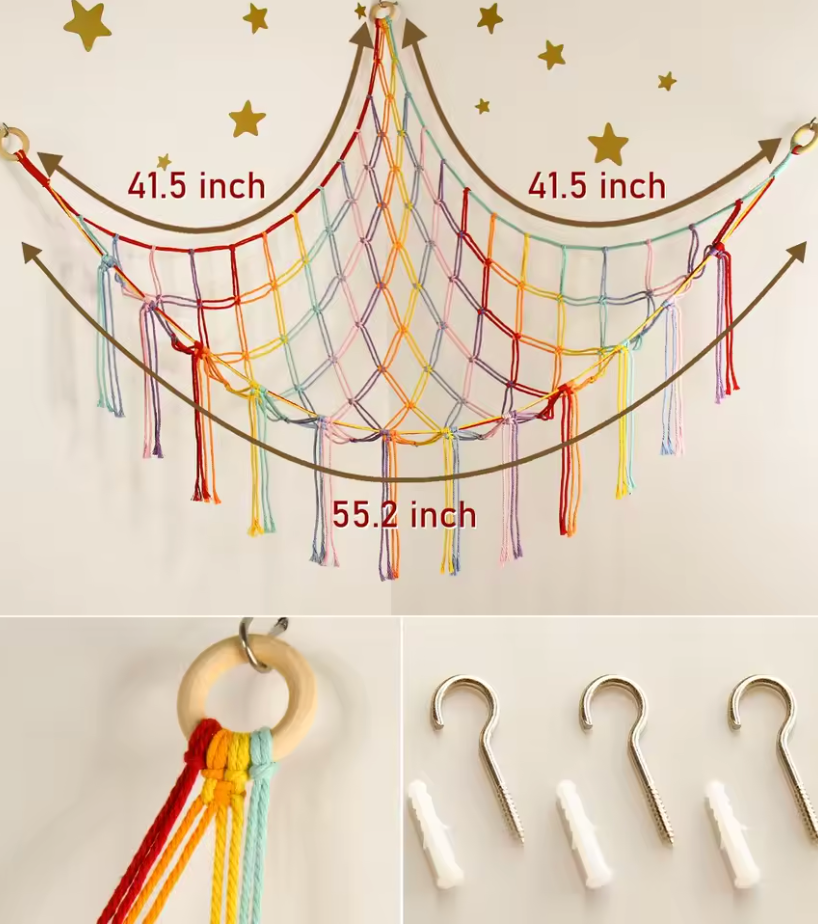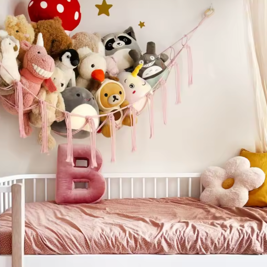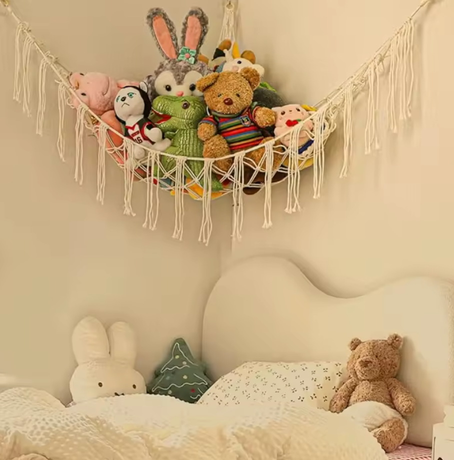 Hamaca de tela diseñada para organizar y almacenar juguetes de manera práctica, manteniendo los espacios ordenados y accesibles para los niños.